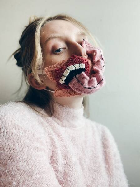 Ýr Jóhannsdóttir (Ýrúrarí) wearing a mask cover she knit during Covid-19 stay-at-home orders in Reykjavik, Iceland. Image courtesy of Ýr Jóhannsdóttir, 2020.