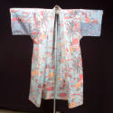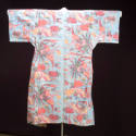 DescriptionResist dye; light blue back-ground, floral and animal designs, multicolored. Sleeve gusset, long collar=Okinawa Ryukyuan construction. Mostly large pattern stencil with some patches of small pattern on the front of the sleeves.