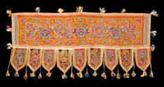 DescriptionRectangle with 7 "hanging leaf" shapes at bottom. Red, green backgrounds. Multicolor floral and bird designs in chain and straight stitches. Bound edges. Fabric tassels. Lined.c. 1945