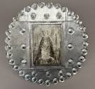 DescriptionTin frame is stamped with circular designs around the edge, and three of the same stamped designs on each side of the central rectangular opening. The black and white photo is of Our Lady of the Lakes, and is covered with glass. The tin backing for the photograph is soldered to the frame and is probably from a tin can.1935-1943