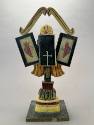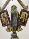 DescriptionNiño Escondido, original at Cordova Church, copied by Juan A. Sanchez, For Federal Art Projects, WPA, July 1939.A kneeling, painted, male figure in brown and red against a yellow background inside a red frame is attached at an angle to a green glass-enclosed nicho with two circular flower designs at top. A kneeling, painted, female figure in brown, red, and black against a yellow background inside a red frame is also attached at an angle on the right side of the nicho. The two s-shaped pieces are attached to the tops of the two frames and are joined under the top of the nicho. Inside the nicho is a naked, carved child. The whole "altar" sits on a four level pedestal painted in green, black, red, and yellow.