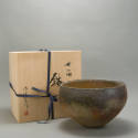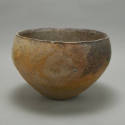 DescriptionThree pieces: vase, box + lid. Large, open bowl rises from small base. Gray clay with patches of color caused by use of frits; colors are black, orange, silver-gray, red. Glazed inside and out. Box built to fit. Include box.