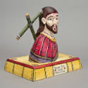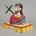 DescriptionBust of a male figure with brown hair and beard resting on a base. Blood runs down his forehead, nose and left check, and neck. His collar is gold with red and green design, his tunic is red with white and black stripes and white and black design between the lines. A purple robe hangs off one shoulder, has purple and gold stripes, and purple, red, and white designs between the stripes. A green cross grows out of his back, and the cross has gold, red, black and white bands on the ends, and a purple, blue, and white flower in the middle. The gold base has brown edges and brown, green, and white flowers with green leaves and vines in each corner. The sides of the base are also gold and have black vertical straight and wavy lines with red dots. The title is on the front of the base. Signed and dated on the back.