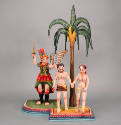 DescriptionAdam and Eve are holding hands as they walk from the Garden of Eden at the front of the bulto. Adam has black hair and beard and is only wearing a brown loincloth with a gold lining. In his right hand is a red apple with two bites taken out of it. Eve has brown hair and is wearing only a blue loincloth with a gold lining and has an upturned left foot. Towering directly behind them is a brown palm tree with ten green and black palm fronds. Also behind them and to the left is an angel whose upraised right hand holds a green and gold sword and his left hand points out of the garden. He wears a helmet in red and gold with black inserts with white flower and feather decoration. The helmet also has a red plume attached to the back and curving forward. He wears a three tiered outfit. At the top is a chest protector in green with gold and red decoration. Below that is a red skirt with black and gold trim. Below that is a short green skirt that is scalloped and comes only to the knees in front and hangs below the knees in the back. The underside is painted red. He wears black Roman style sandals below the knee and on the back of his bare feet. The rolled tops are red with black vertical lines. On his arms are short puffy sleeves with red, white, green, and blue stripes. His wings are carved in three layers of feathers painted white with red, blue and gold edges. The back of the wings are painted green and gold and are not carved. The top of the base under the angel is green for the Garden of Eden, and is brown under Adam and Eve to represent the desert. The base is irregularly shaped with Adam and Eve standing on the projecting right side which has a straight front and curved back. The angel on the left stands on a semi-detached left section that is recessed and curved on the front and flat on the back. The top step of the base is edged in two red steps with a white section in be between with a series of two blue diagonal lines. The bottom step is blue with white marks and has blue, white , and green stripes along the edge, with the blue representating water.1980s