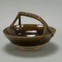 DescriptionBrown round bowl with cane? vine? handle attached at rim through 4 holes footed.20th Cent