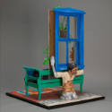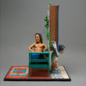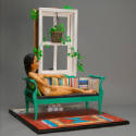 DescriptionTanned, nude, black haired female lays on couch, propped up on pillows in front of a white window. A multicolored rug lies in front of the couch, and a large potted plant hangs from the window. From the other side, one can see that the deep window (blue on this side) is supported on the shoulders of a kneeling black haired man with blue eyes who faces away from the window. His skeletal arms hold the sides of the frame. His shirt is white on top, but his midsection is painted with bricks and reads "ADOBE Brother Const.",and his pants and legs are built of cobblestones. Before him is a sandy brown strip.