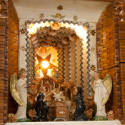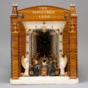 DescriptionWood "brick" sculptural building with stage-like scene including coffin with dove on lid flanked by kneeling man and woman in black, pair of angels, candles, baskets of flowers. Candelabrum behind coffin. Scene narrows towards back with multiple pairs of false drapes and stairs leading the eye back to rear. Inset with light bulb in star flanked by pair of angels. False front reads: The Sepulchre 1958.Artist not recorded