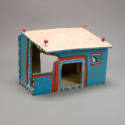 DescriptionCeramic building model of a house. The house is painted blue, green, white, and red. It is open with a slanted roof with four attached purple balls on the roof. Medrano workshop.