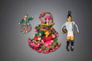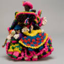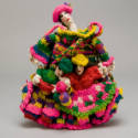 DescriptionMulticolored, in shape of woman with full skirt, head with pink hat and black braids at top. 2 children on front of skirt, 2 on back. 2 holding balls of yarn, 2 with baskets. Ruffle at skirt bottom. Rainbow colored strap from shoulders.
