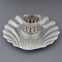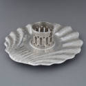 DescriptionSilver shell shaped plate with engraved and stamped floral and geometric decoration and attached central cup holder with open pierce work around circumference. Shallow footed base. Cup holder attached by screw and nut. No marks.