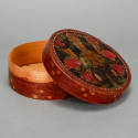 DescriptionFor cake of cheese. Circluar pegged top with colored litho -- baroque male figure with tulips -- on cover. (1948).
