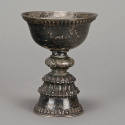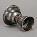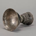 DescriptionTarnished silver chalice form. Knob of stem engraved with floral accents. Tapered base of several layers with scalloped edges.