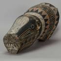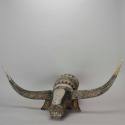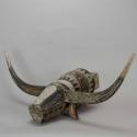 DescriptionA wooden carved (a) bull head (water buffalo) with (c,d) long outward horns and geometric designs that adorn Mamasa Toraja buildings. (e,f) ears.