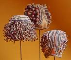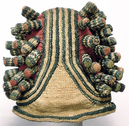 DescriptionThe hat is partially made of knitted cotton and sewn-in circular patches of a dark red, light-weight, woven cotton (lined with a heavier woven cotton). The knitted edges around the woven patches are striped light and dark in a pearling technique. The patches themselves are covered with 1" X 1/2"D stubby spikes. These have been covered in a knit-one/pearl-one knitting in alternating dark and light stripes. Their tips are finished with appliqued patches of green and red felt; colors are off-white, red, blue, orange-red, pale green; made of cotton and wool; techniques are knitting and applique. Color: Red, blue, natural tan Technique: Knotting, Knitting and applique piecework Worn by chiefs and village elders who have attained important status in a village.Artist not recorded