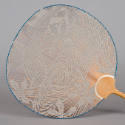 DescriptionWood hand fan, intricate design of swirling lines and shapes woven into fan with grey cut-outs, outer edge of fan is dark blue, handle of fan is light colored wood.