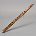 DescriptionOf softwood, tubular, 9 bands of tin along barrel are hand cut, 5mm to 7mm wide and 4 to 6cm apart. Mouthpiece has one opening 3.5 cm from top, 2 openings at sides, 1.5 cm below top, 1 at back, 3.5 cm from top. Six openings on front cut at slight angle, upwards, lowest and largest 24 cm below top. Movable bridge or stop, of hardwood, has sharp corners, shaped like a boot with toe pointed toward mouthpiece. Stop tied to flute with buckskin. Two strand copper wire wrapped around bottom, fine brass wire around tapered end.Late 19th century