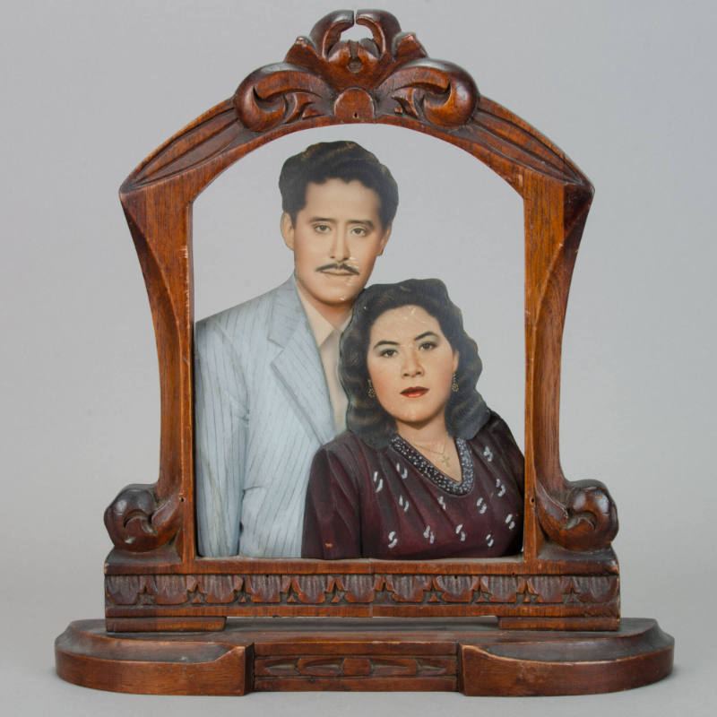 DescriptionPortrait of a man and woman: Man has short hair, mustache, and is wearing a light-colored jacket; woman has shoulder-length hair and is wearing earrings, a necklace with a cross pendant, and a dark top. The frame is rectangular with an ornately-carved arched top and is attached to a carved base.Artist not recorded