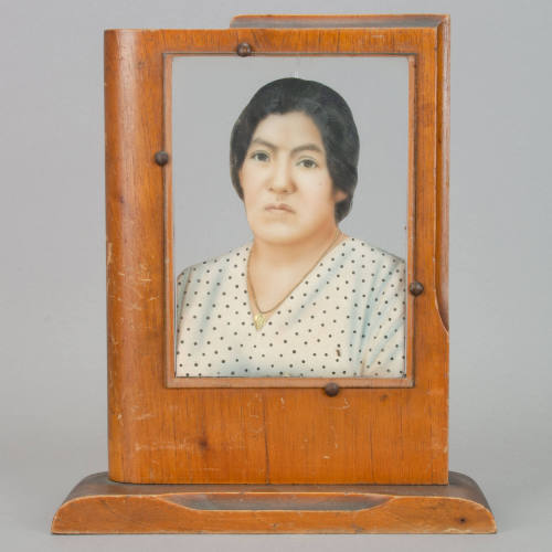 DescriptionPortrait of a woman wearing a necklace and a V-neck white top with dark polka dots. The uncarved from in a rough rectangle attached to a base.